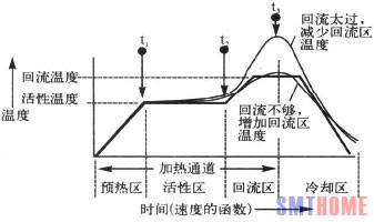焊錫膏回流過程,焊錫膏在回流爐加熱的環境中,焊錫膏的回流分為四個階段: