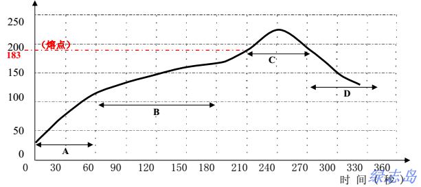 以下是綠志島焊錫廠建議的熱風回流焊工藝所采用的溫度曲線,可以用作回焊爐溫度設定之參考。該溫度曲線可有效減少焊錫膏的垂流性以及錫球的發生,對絕大多數的產品和工藝條件均適用。
