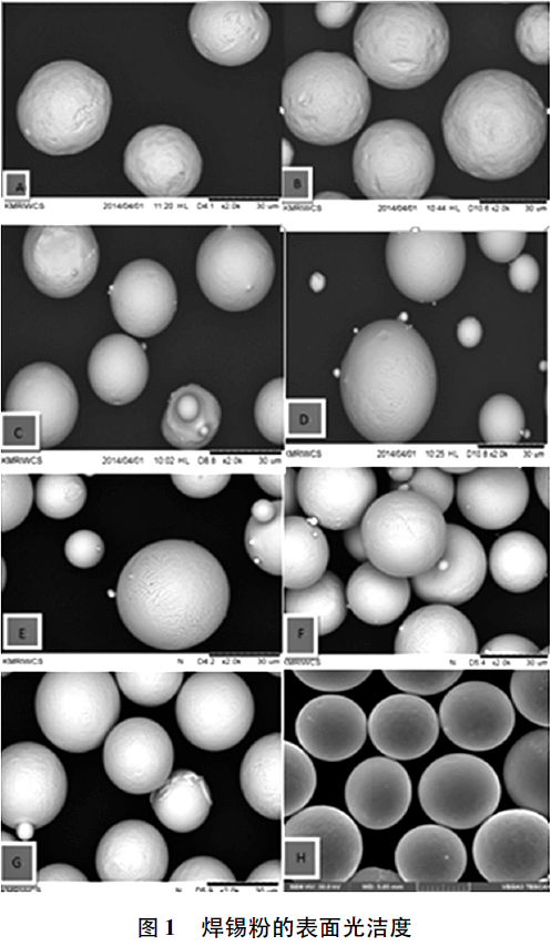 4號(20~38μm)焊錫粉是焊料市場的主流,本文選用不同形貌SnAg3.0Cu0.5的4號焊錫粉與同一種助焊劑配制成焊錫膏進行測試。將不同形貌的焊錫粉編號為A~H,焊錫粉放大2000倍的表面光潔度如圖1所示,SEM圖中從A到H焊錫粉的表面逐漸光滑。將A~H焊錫粉與同一助焊劑配制焊錫膏編號為1#~8#,選用綜合性能較好,且已投入生產的A500助焊劑與各種焊錫粉配制焊錫膏。配制焊錫膏的工藝參數完全相同,即助焊劑A500質量百分比11.5%,焊錫粉質量百分比88.5%。