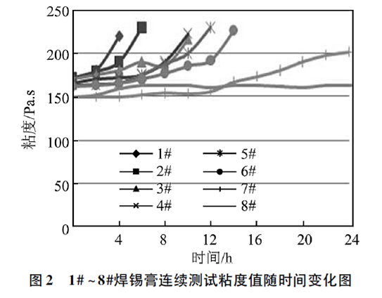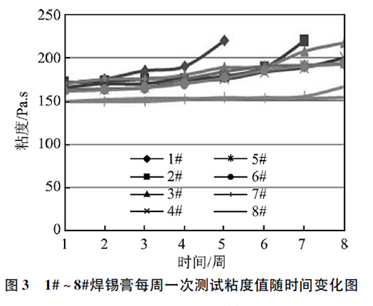 從圖3看出,1#、2#焊錫膏連續測試不到8周砂化,3#~8#焊錫膏在8周測試時間內未砂化,但3#~6#焊錫膏粘度變化較大,粘度變化超過20%,不利于焊錫膏印刷使用。7#、8#焊錫膏粘度值穩定,保質期較長。